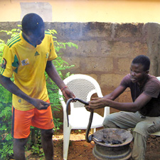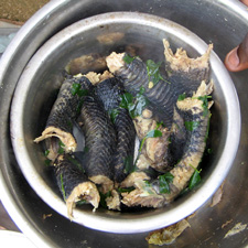 gekocht werden sollte wurde sie in ca. 10 cm lange Stücke geschnitten und mit Zwiebeln, Salz und Moringa gekocht. Als stille Beobachterin