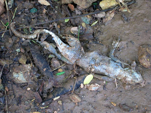 In einem Eimer schwamm dann tatsächlich eine halbverweste, ca. 20 cm lange Echse. Dann wurde Francis an einem Seil runtergelassen