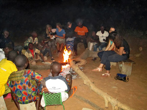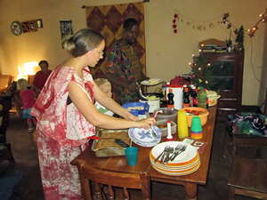 An Silvester trafen wir uns alle auf unserem Sportplatz um’s Lagerfeuer. Es war ein buntes Gemisch von Weiß und Schwarz, Deutschen, Franzosen und Beninern, Kindern, Jugendlichen und Erwachsenen. Wir sangen, erzählten Geschichten, kurz vor Mitternacht zählten wir alles auf, was Gott für uns in 2013 getan hat und wofür wir dankbar sind, dann sprachen wir über unsere Pläne für 2014, für die wir Gott um Sein Geleit bitten. Nach einem gemeinsamen Gebet gab es heißen Kakao (die Nächte sind in dieser Jahreszeit recht kühl) und ein Baguette für alle, und gegen 1h30 schickten wir die Meute nachhause. Denn Ausschlafen geht hier nicht, spätestens um 8h stehen die ersten schon wieder da, um ein gutes Neues Jahr zu wünschen! Am Neujahrsabend hatten wir dann ein gemütliches Team-Potluck (früher hieß das Schuhschachtelparty – jeder bringt was zu Essen mit) mit vielen leckeren Sachen und guten Gesprächen.