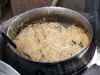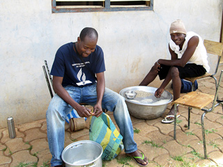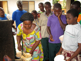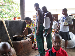 Die Organisation der Verpflegung lag in den Händen der Gemeinde Natitingou und gestaltete sich erst als sehr schwierig, da der Ausschuss diesbezüglich auf unsere Frauen gezählt hatte und diese dann aus verschiedenen Gründen nicht zur Verfügung standen. Dazu kommt, dass wir bis zum Beginn des Lagers nur eine sehr vage Ahnung hatten, wie viele Jugendliche teilnehmen würden. Und schließlich wurde uns der Vorschuss für die Einkäufe der Lebensmittel erst in allerletzter Minute bewilligt und überwiesen, so dass wir am Tag vor der Eröffnung sehr großen Stress hatten. Nachdem dem Pastor zugeflüstert worden war, dass Toussaint immer bei unserer Montagsschulung kocht und auch bei einem mehrtägigen Seminar für die Küche zuständig gewesen war, fragte er ihn, ob er bereit wäre, die Leitung der Küche für das Pfadilager zu übernehmen. Er sagte zu und mit Hilfe seiner Nichte [die aber gleich alt ist wie er] und eines jungen Mannes aus unserer Nachbarschaft bekochte er 5 Tage lang die ganze Truppe. Da wir ein sehr schmales Budget hatten, mussten wir etliche Male den Speiseplan abändern und auch ein bisschen improvisieren, doch es hat jedes Mal für alle gereicht und sie bekamen von den Jugendlichen ein großes Lob für das leckere Essen. Und am Ende war ich froh, meinen Mann mal wieder zu sehen, nachdem er fast eine Woche lang von 6h30 bis 22h außer Haus gewesen war.