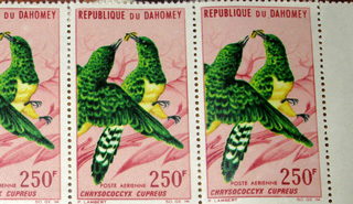 Es kommt immer mal wieder vor, dass die gängigen Marken aus sind und man dann stückeln muss. Also statt einer 600er Marke kriegt man dann zwei 250er und eine 100er oder so. Und wenn der Bestand ganz aufgebraucht ist, greifen die Postbeamten auch schon mal in die Antiquitätenkiste. Und so bekam ich dieses Mal diese Briefmarken ausgehändigt. Sie datieren noch aus der Zeit der Republik Dahomey.