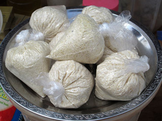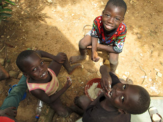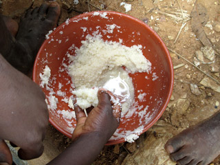 Was tut man für den kleinen Hunger zwischendurch? Man isst Gari. Gari wird aus der Maniokknolle gewonnen, in einem komplizierten Verfahren von Einweichen, Fermentieren, Trocknen, Raspeln und leichtem Anbraten. Am Ende kommt dabei ein weißes Pulver heraus, das ein bisschen wie Parmesankäse aussieht (aber sonst keinerlei Ähnlichkeit damit hat!). Es ist ziemlich unbegrenzt haltbar und kann in kleinen Tütchen abgepackt überall gekauft werden. Zum Verzehr wird es dann einfach in kaltes Wasser eingeweicht, wodurch es ordentlich aufquillt und somit schnell den Bauch füllt. Normalerweise gibt man Zucker hinzu, manchmal auch Erdnüsse. Ich mag es überhaupt nicht, aber viele Menschen (besonders diejenigen die nicht kochen können oder wollen) essen Gari regelmäßig, manchmal sogar als richtige Mahlzeit. Ansonsten ist es wie gesagt eine schnelle Lösung für den Hunger zwischendurch, auf dem Feld oder auf der Baustelle. Die Kinder sind auf jeden Fall alle ganz scharf drauf.