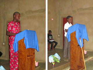Der gestrige Sabbat stand weltweit ganz im Zeichen der Kinder, und auch wir hatten uns wieder große Mühe gegeben, ein besonders Programm auf die Beine zu stellen. Als Leiterin der Abteilung Kinder der Gemeinde Natitingou ist es meine Aufgabe, diese Sabbate mit den Kindern vorzubereiten. Als Thema hatte ich den Bibelabschnitt in Matthäus 18, 21-35 über das gegenseitige Vergeben gewählt. 6 Wochen lang traf ich mich jeden Sabbatnachmittag mit den Kindern um zu proben. Wir lernten neue Lieder, etliche Kinder lernten Bibelverse auswendig, ein älterer Junge bereitete sich auf die Predigt vor, und außerdem probten wir die Geschichte vom unbarmherzigen Knecht als Sketch ein. Sketche kommen sowohl bei den Spielern als auch bei den Zuschauern immer gut an! Die Kinder waren gut vorbereitet, aber natürlich aufgeregt, als der große Tag endlich da war. Der gesamte Predigtgottesdienst wurde komplett von den Kindern gestaltet, außer dem Übersetzer war kein Erwachsener auf dem Podium. Ich saß in der ersten Reihe, um zu soufflieren, aber das war überhaupt nicht nötig. Die Kinder übertrafen sich selbst und jeder spielte seine Rolle ganz ausgezeichnet. Ich hatte mich besonders darüber gefreut, dass es mir diesmal gelungen war, etwas schüchternen Kindern, die sich sonst nicht trauen, eine Rolle zu geben. Sie machten ihre Sache ganz hervorragend!