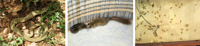 Mit der Regenzeit und dem zunehmenden Grün um unser Haus herum kommen auch die Tiere – meistens ungebetene. Schlangen im Feld und im Gebüsch entlang der Hausmauer, ein Skorpion in unserer Toilette und vor allem ganze Mäusefamilien. Einmal fiel eine Mutter mit ihrem Kind in die leere Regentonne, aber meistens rennen sie einfach nur frech vor unseren Augen durchs Haus. Dabei umgehen sie geschickt alle von uns aufgestellten Fallen, und manchmal hilft nur noch das Erlegen mit einem Schuh. Klappt natürlich nur, wenn man mutig und schnell genug ist. Nach ergiebigen Regenfällen kommen abends die Termitenschwärme und umkreisen das Licht. Ganz besonders schlimm sind dieses Jahr die Würmer, die in Gruppen kommen und alles belagern. Sie sind zwar nicht schädlich, aber einfach nur eklig. Und zu unguter Letzt kommen ganze Armeen von Moskitos, die sogar den armen Hunden den Schlaf rauben, denn die schlafen natürlich nicht unter einem Moskitonetz. Wir sind zwar nachts geschützt (obwohl sich auch immer wieder einige Moskitos ins Netz einschleichen), doch tagsüber und vor allem abends sind wir ihnen gnadenlos ausgeliefert. Insektenspray kommt nicht in Frage, da das bei Toussaint Hustenanfälle auslöst. Und so war es nur eine Frage der Zeit, bis es einen von uns erwischen würde. Da mein System gleichzeitig durch eine Infektion geschwächt war (was ich zu diesem Zeitpunkt aber noch nicht wusste), schlug die Malaria bei mir zu, die erste seit einigen Jahren. Als die Medikamente aber keine echte Besserung brachten, ließ ich noch einige weitere Tests machen, und dabei kam die erwähnte Infektion zutage, die dann mit Antibiotika behandelt wurde. Seit gestern ist die letzte bittere Pille geschluckt und es geht mir wieder gut, wenn ich jetzt auch meine Kondition erst so langsam wieder aufbauen muss.