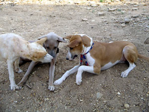 ab zum nahe gelegenen Bach. Los ziehen vier hübsche junge Hunde. Zurück kommt eine Herde lehmverkrusteter Schweine. Gestern rannte