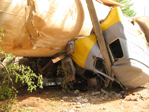 Freitag, 22.04.11: Gestern hat sich am Ortseingang von Natitingou ein schwerer Unfall ereignet. Bei einem Lastwagen hatten die Bremsen versagt. Vor dem Ortseingang geht es auf der von Burkina Faso kommenden Nationalstraße steil den Berg runter. Das konnte der Fahrer wohl irgendwie noch bewältigen, doch als er dann in die Stadt einfuhr, war vor ihm plötzlich ein anderer Lastwagen, auf den er unweigerlich draufgefahren wäre, da er ja die Geschwindigkeit nicht drosseln konnte. Er zog deshalb den Laster blitzschnell nach links, überquerte die Gegenfahrbahn, den Wassergraben und raste dann immer noch ungebremst in ein Wohnhaus, das er völlig zerstörte. Die Fahrerkabine prallte dabei mit der Beifahrerseite gegen einen Strommasten, wobei der Lehrling des Fahrers ums Leben kam. Glück im Unglück - es war kein Tanklastwagen, so dass wenigstens kein Treibstoff auslief, und es war gerade niemand im Haus, sonst wären ganz sicher noch mehr Tote zu beklagen gewesen. Der Hausbesitzer hatte das Haus nur wenige Minuten zuvor verlassen. Solche Unfälle kommen leider im wieder vor, da es hier keinen TÜV gibt bzw. nur pro Forma. Wenn man dem Antrag nur einen Geldschein beilegt, so kriegt man ohne jegliche technische Untersuchung einen Stempel in die Fahrzeugpapiere und darf für ein weiteres Jahr sein Wrack fahren.
