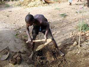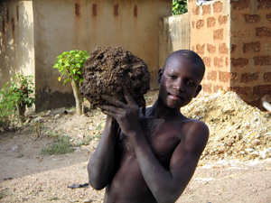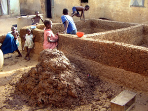 die älteren Kinder, wobei die Kleinen beim Bewässern (man könnte auch sagen Matschen) helfen. Dann wird der Lehm brockenweise zum Bauplatz