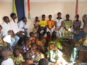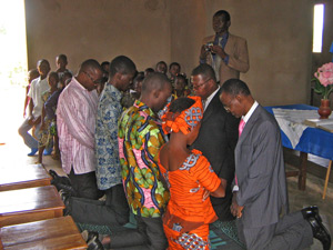 Als gegen 14h der Vormittagsgottesdienst schließlich zu Ende war, freuten wir uns alle über das von unseren Frauen zubereitete Essen. Gott hatte unsere Gebete erhört und den Himmel an diesem Mittag von Regenwolken freigehalten. Wir haben ja keine Nebenräume, und schon gar nicht für solche Massen, so dass alle im Freien unter den Bäumen auf Bänken saßen, um ihr Essen zu sich zu nehmen. Um 16h ging es dann mit einer Kindersegnung von zwei Babys weiter. Im Anschluss daran feierten wir noch zusammen Abendmahl und schließlich gab es noch einige interessante Geschichten des Evangelisten, der die Gruppe Natitingou im Jahre 1988 ins Leben gerufen hatte. Gegen 18h war dann auch die Nachmittagsveranstaltung zu Ende und wir waren alle ziemlich geschafft, aber auch dankbar, dass alles gut über die Bühne gegangen war.